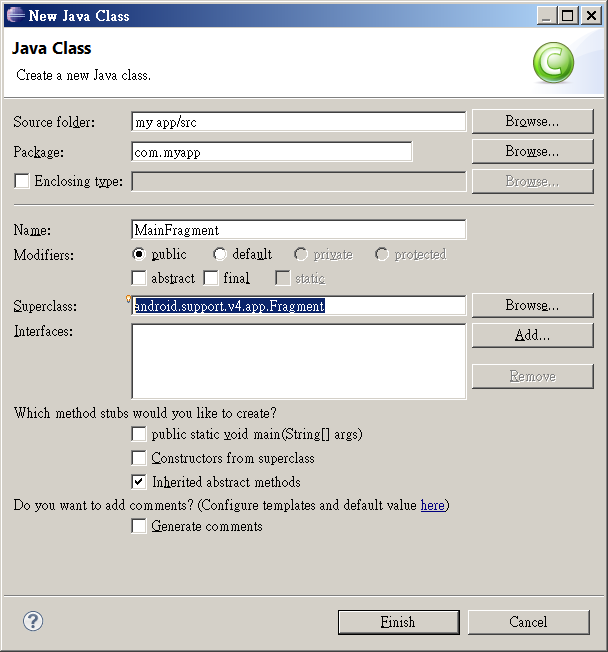 Step 5. 在「新增類別」對話盒中輸入新類別的名稱,例如MainFragment,然後按下Superclass欄位最右邊的Browse按鈕,在出現的對話盒上方欄位輸入Fragment,下面的清單中會篩選出Fragment類別。在篩選出來的項目中會有二個Fragment類別,一個是在android.app套件路徑中,另一個則是在android.support.v4.app套件路徑。請選擇第二個,也就是在androidsupport.v4.app套件路徑中的Fragment,最後按下Finish按鈕。