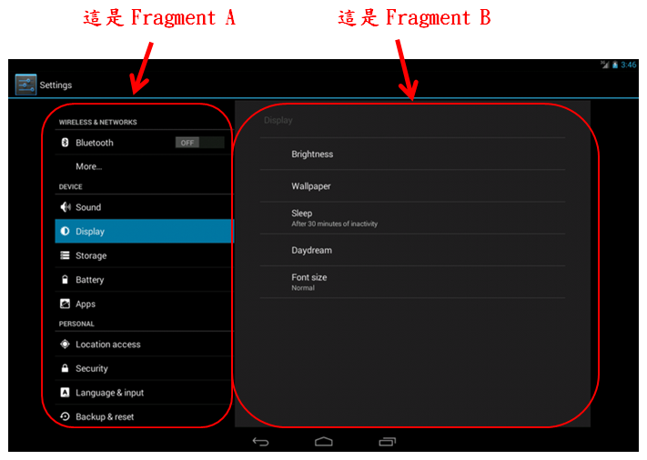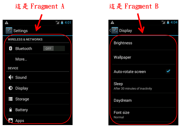 Fragment是Android 3.0以後才出現的技術,它的主要目的是讓App的執行畫面,可以隨著手機和平板電腦的螢幕大小自動調整。例如在手機上開啟Settings功能時,畫面會先顯示主項目列表(參考附圖)。這個主項目列表其實是一個Fragment物件,當我們點選其中的項目時,畫面會切換到另一個顯示細項的Fragment物件。如果是在平板電腦上執行Settings功能,主項目列表的Fragment和顯示細項的Fragment會同時出現。這個Settings程式就是利用Fragment技術,讓程式畫面可以隨著裝置的螢幕大小,改變顯示的方式。接著我們來比較一下單純使用Activity的程式架構,和加入Fragment之後的程式架構有何差異。
